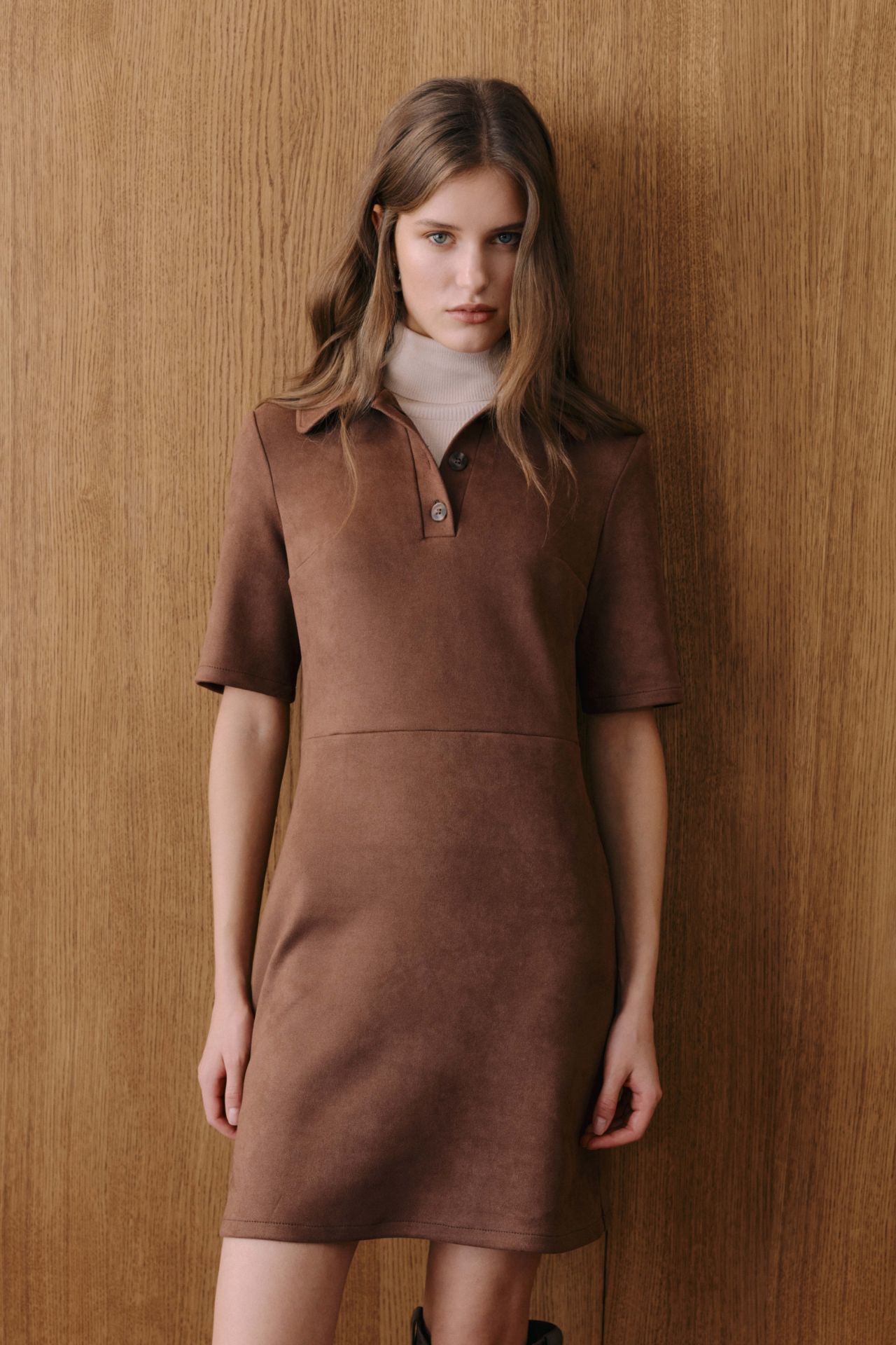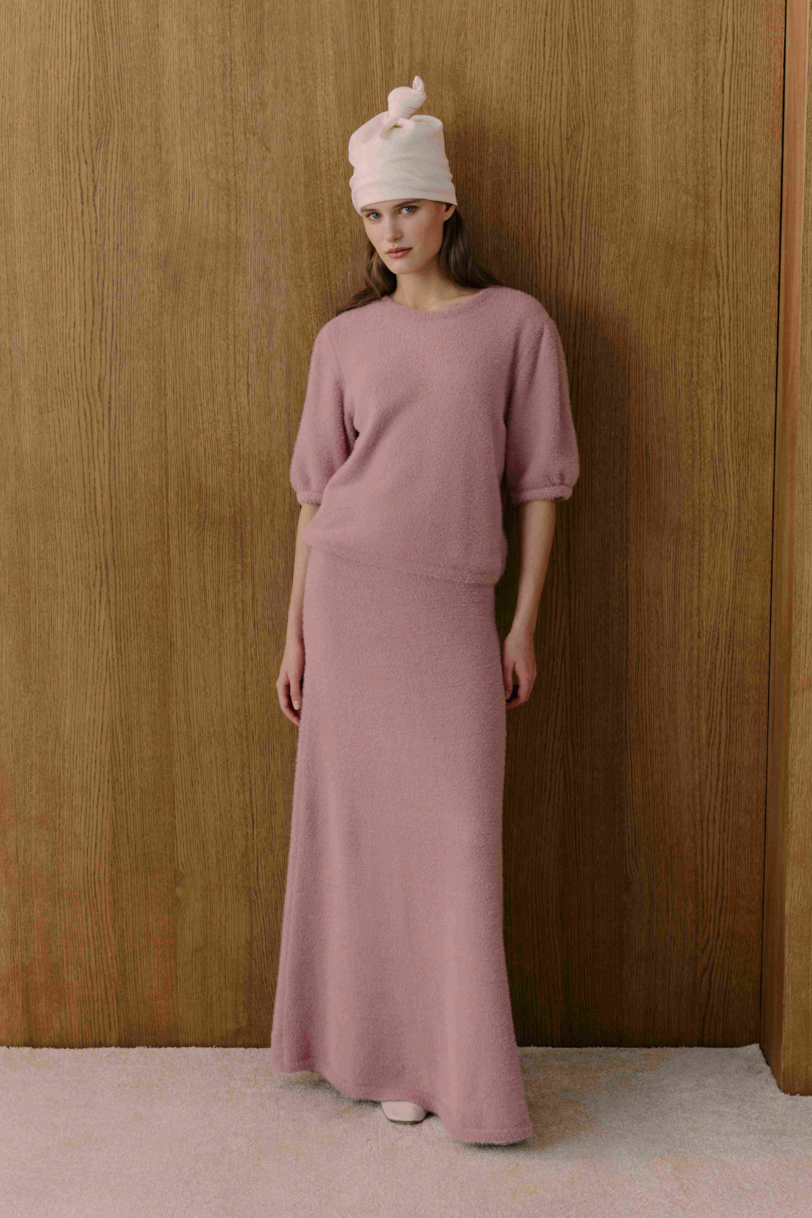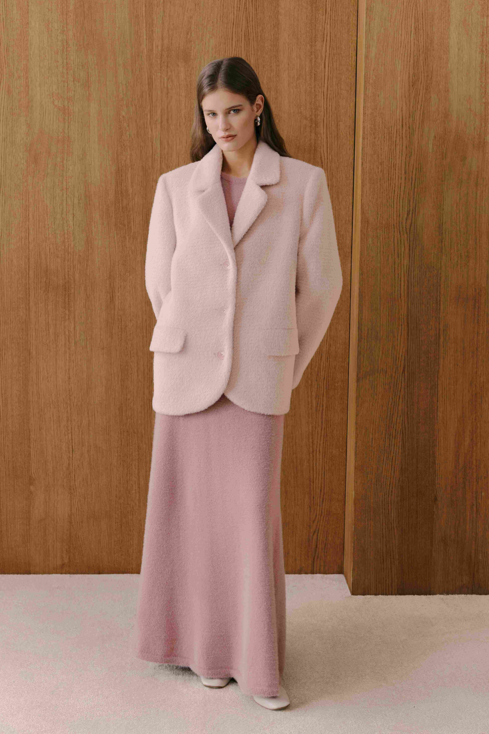 Силуэты и настроение стиля семидесятых считываются практически в каждой модели, к примеру, в свитерах крупной вязки и вязаных костюмах, а также в key item коллекции - платьях и костюмах в замшевой фактуре.