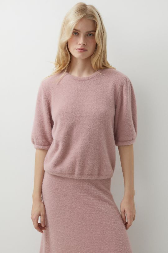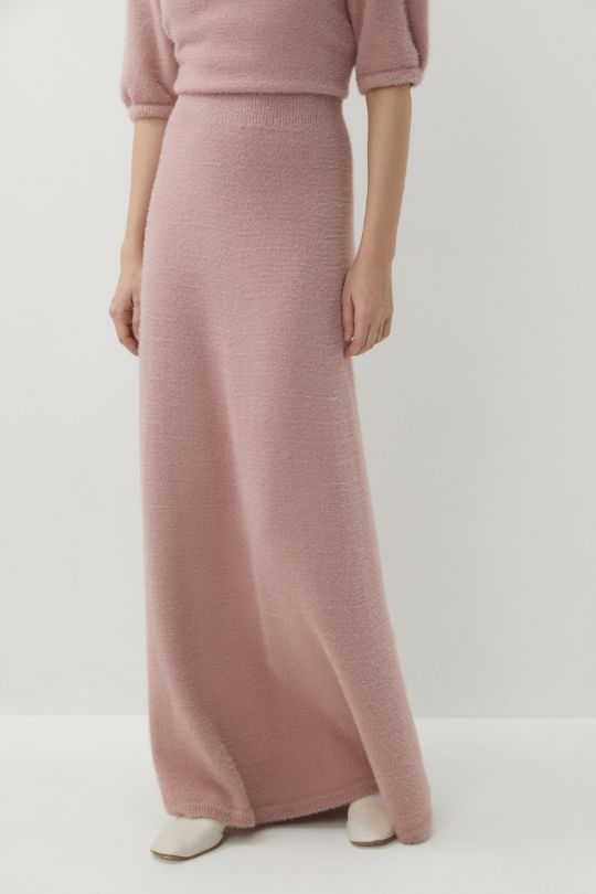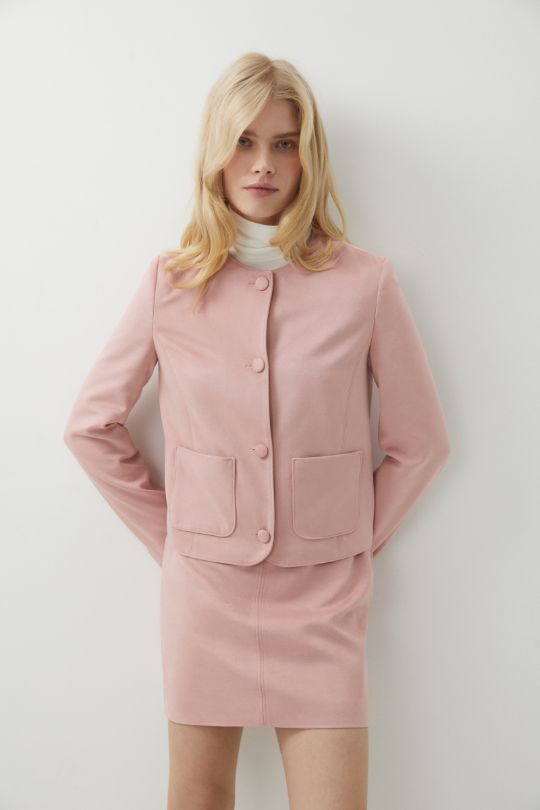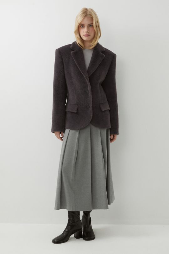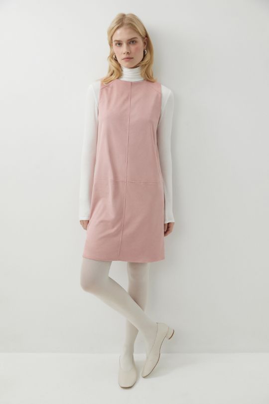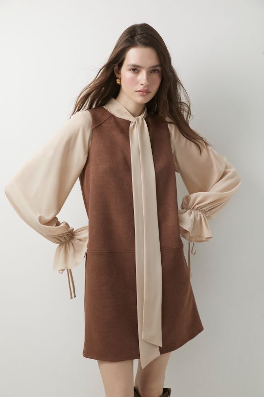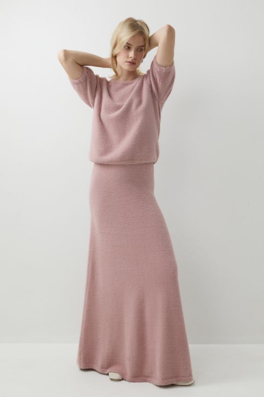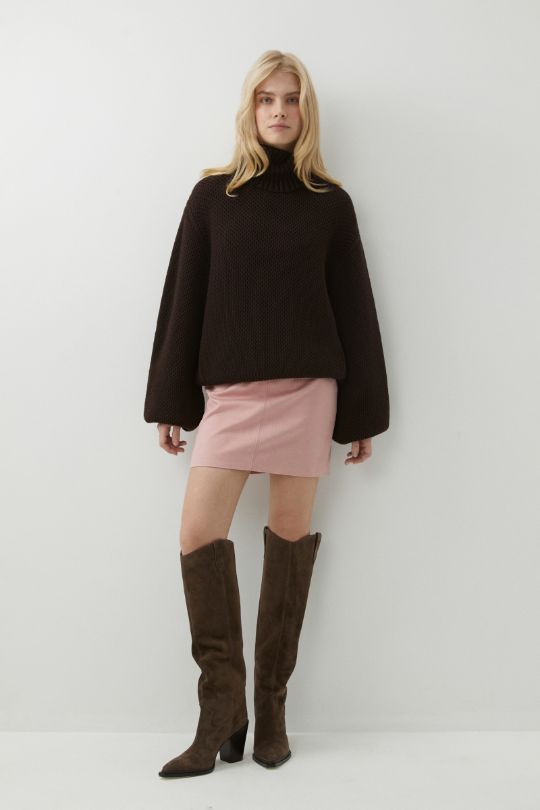 Силуэты и настроение стиля семидесятых считываются практически в каждой модели, к примеру, в свитерах крупной вязки и вязаных костюмах, а также в key item коллекции - платьях и костюмах в замшевой фактуре.